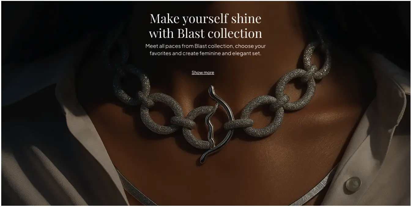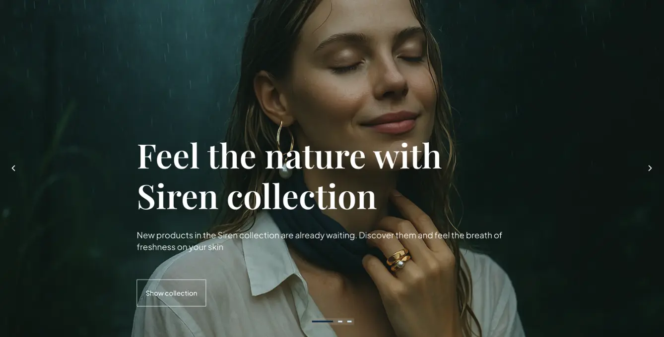 Chcemy, aby przeglądanie sklepu było przeżyciem, a nie tylko kolejną powtarzalną czynnością. Efekt głębi (paralaksa) podczas przewijania pozwala zbudować właśnie takie wyjątkowe doświadczenia. Na pierwszym planie zainspiruj klienta – w postaci, nagłówka, treści pod nagłówkiem oraz przycisku z własnym linkiem możesz zaprezentować na przykład nową kolekcję..