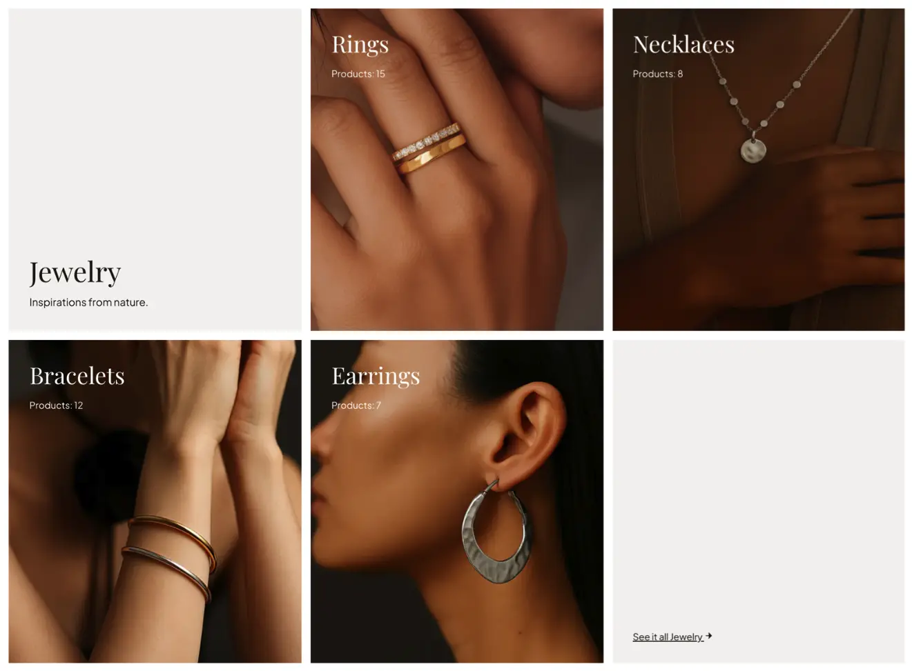 - Zdjęcia z kategoriami produktów w sekcji Jewelery: - grafiki są zaciągane z panelu administracyjneog z pól: "Miniatura kategorii (kafelek)" - 585px x585px