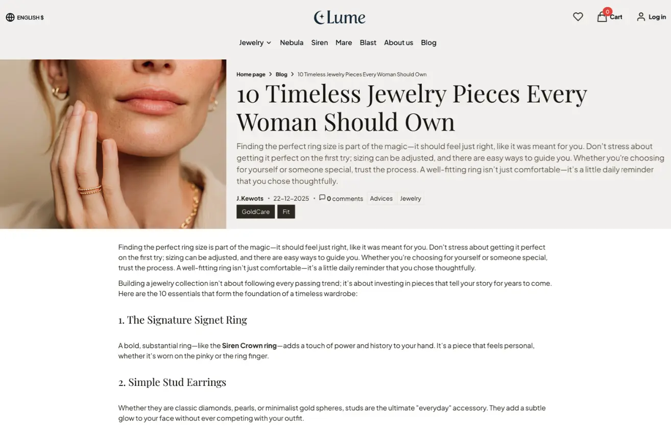 Bezpłatny szablon Lume powstał z myślą o markach, które szukają lekkiej i eleganckiej prezentacji produktów. Bazuje na dużych zdjęciach, lekkiej typografii oraz sekcjach, których zadaniem jest inspirowanie klienta i nastawienie na budowanie relacji opartej o podobną wrażliwość estetyczną.